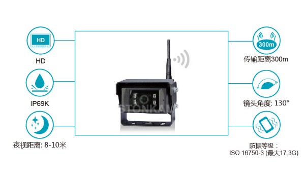 敏视车载数字2.4G无线视频监控摄像头易于安装。 适用于卡车,拖车,吊车,收割机等车辆。与我们的数字无线分割显示器搭配使用可获得更好的效果。